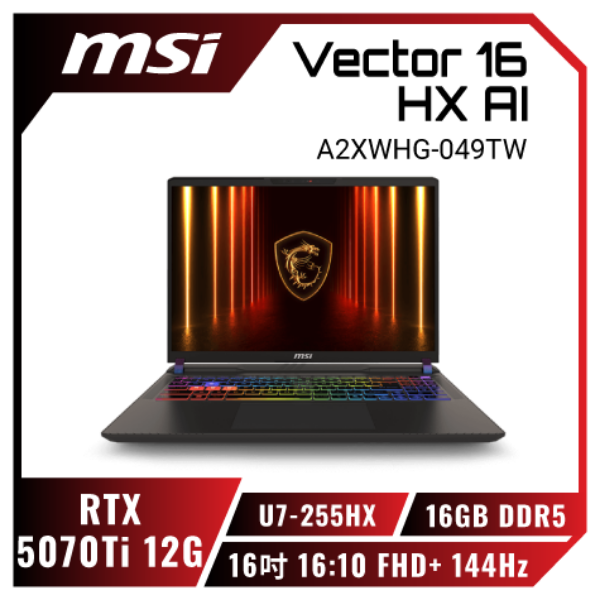 ⭐️MSI Vector 16 HX AI A2XWHG-049TW 微星滿血版AI電競筆電/Ultra 7-255HX/RTX5070Ti 12G/16GB DDR5/512GB PCIe/16吋 16:10 FHD+ 144Hz/W11/SS單鍵RGB背光電競鍵盤+Copilot Key⭐️