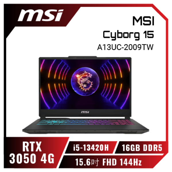 搭載第13代 Intel® Core™ i5-13420H 處理器 搭載 NVIDIA® GeForce RTX™ 3050 筆記型電腦GPU 4GB GDDR6 15.6吋 Full HD (1920x1080), 144Hz更新率, IPS等級面板 最高支援2個外接螢幕輸出(USB-C、HDMI™) 窄邊框面板設計 金屬髮絲紋輕薄質感設計 纖薄設計21.7mm, 極致輕巧1.86kg MSI Center軟體,提供獨家電競模式 MSI App Player 軟體,用電競筆電暢玩手遊 支援播放高解析音樂 Wi-Fi 6E提供極速無線網路體驗 Windows 11 Home