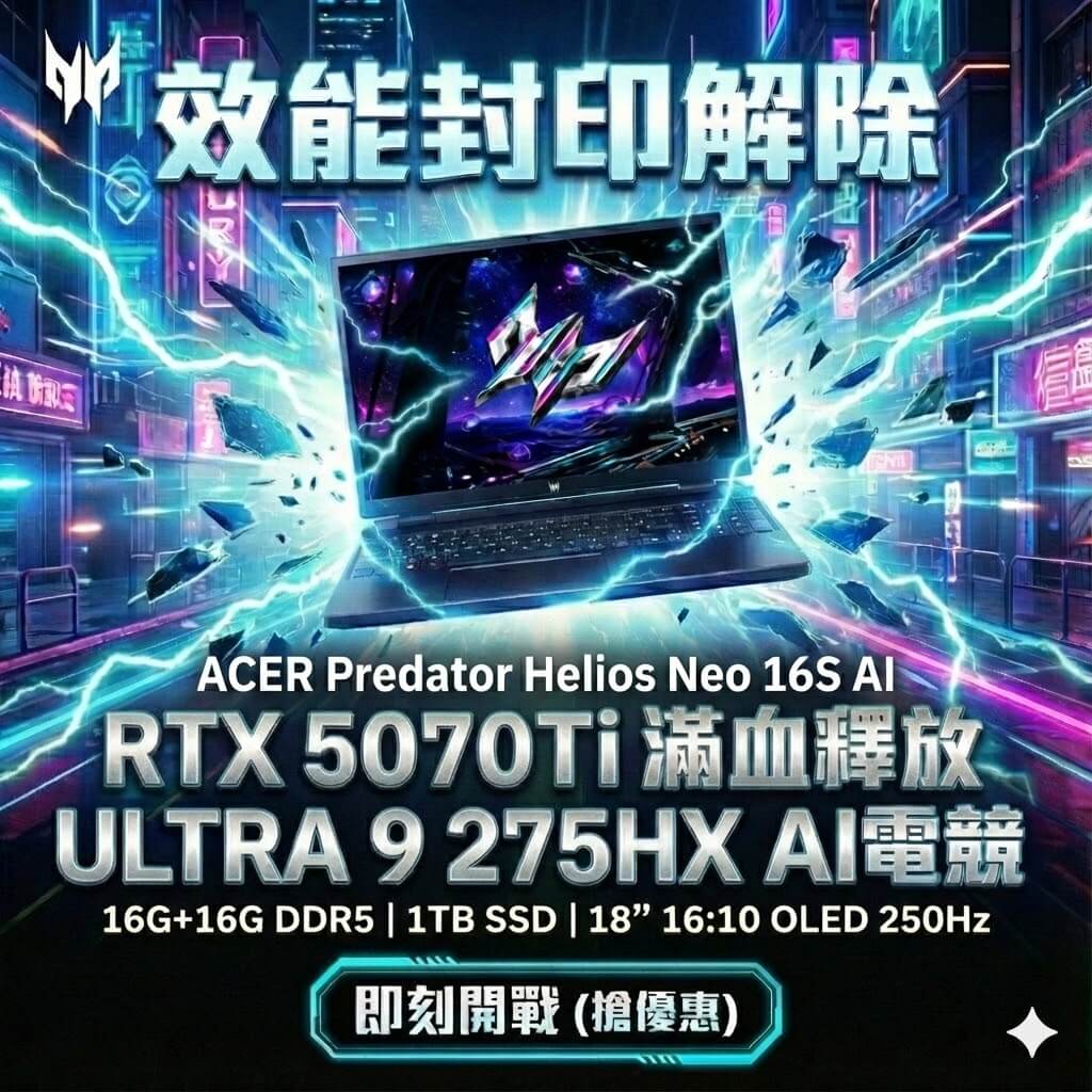 acer Predator Helios Neo PHN16S-71-94UX 宏碁掠奪者電競筆電/Ultra 9 275HX/RTX5060 8G/16G DDR5/512GB PCIe/16吋/W11