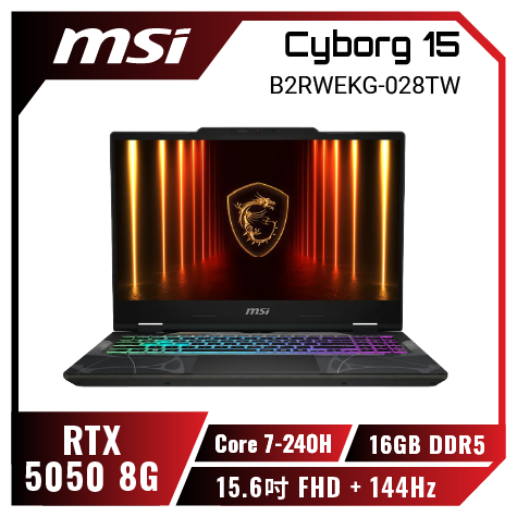MSI Cyborg 15 B2RWFKG-027TW 微星輕薄戰鬥電競筆電/Core 7-240H/RTX5060 8G/16GB DDR5/512GB PCIe/15.6吋 FHD 144Hz/W11/四區RGB鍵盤背光🎈送保護套/滑鼠墊/鍵盤膜🎈