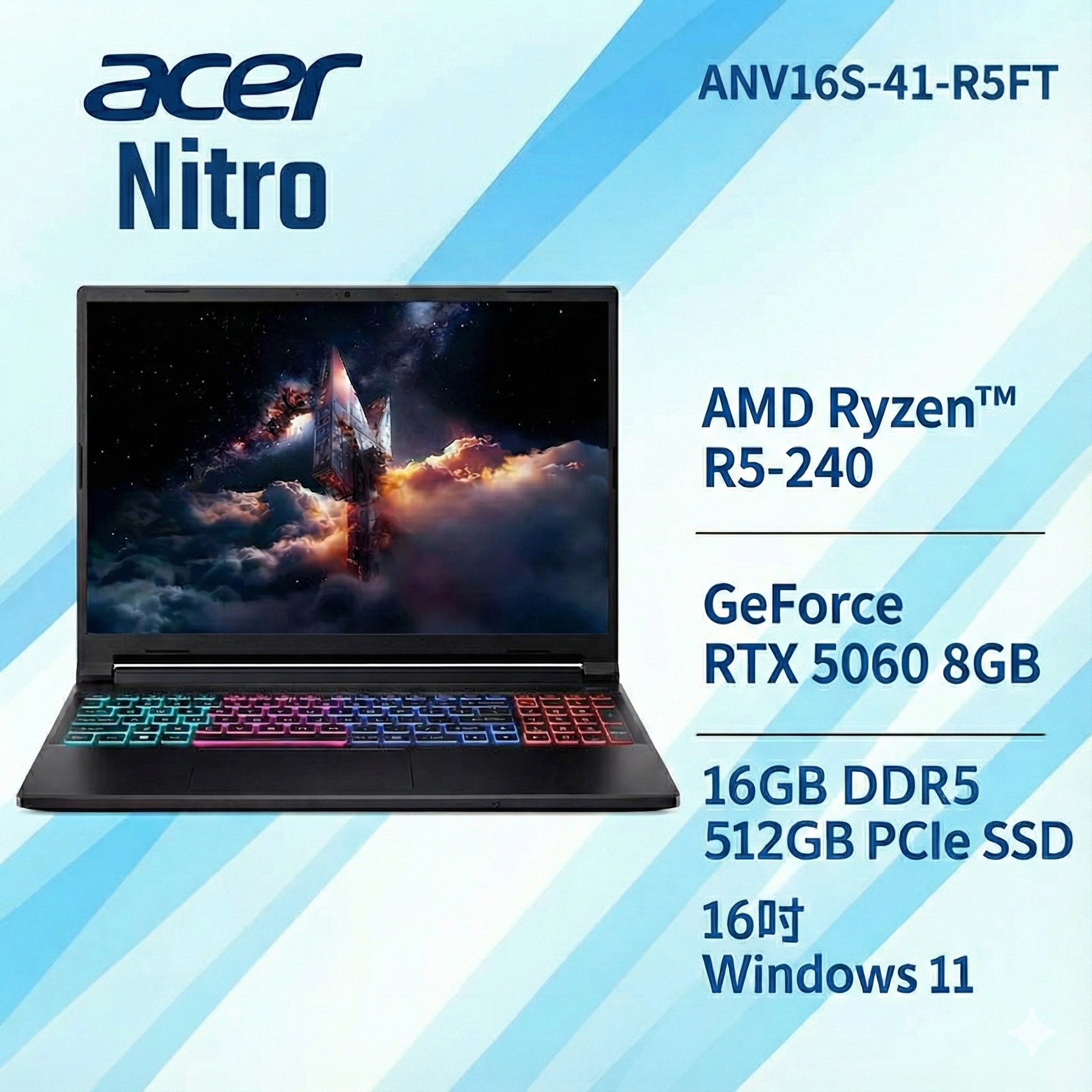 ACER 宏碁Nitro V 16吋 電競筆電黑(R5-240/16GB/512GB/RTX5050-8G/W11/ANV16S-41-R14L)