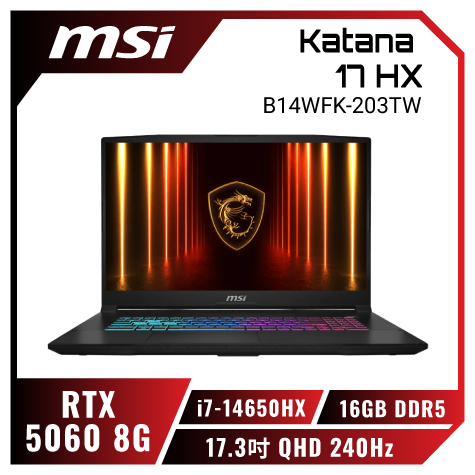 MSI Katana 17 HX B14WGK-037TW 微星13代炫彩戰鬥款電競筆電/i9-14900HX/RTX5070 8G/16G DDR5/1TB PCIe/17.3吋 QHD 240Hz/W11/四區RGB背光電競鍵盤🎈送保護套/滑鼠墊/鍵盤膜🎈