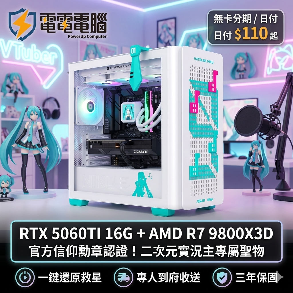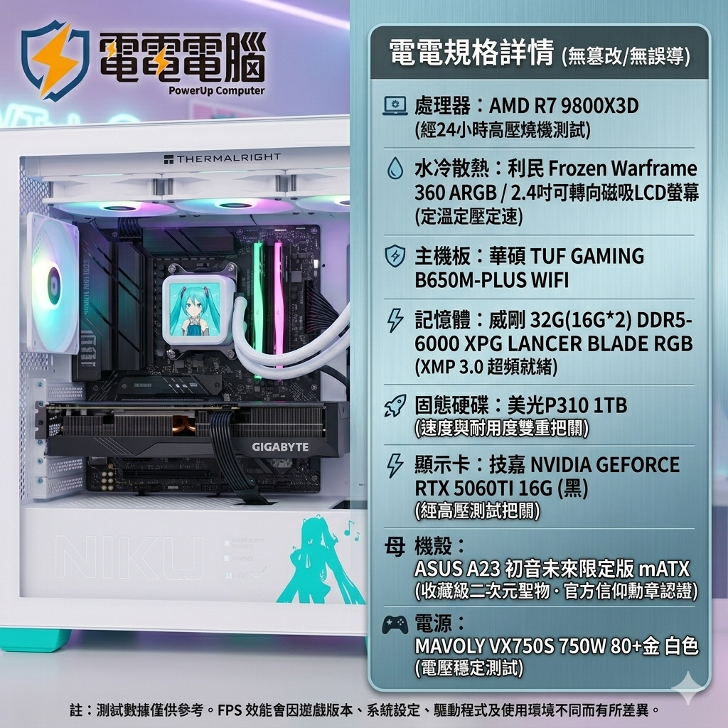 每一台都經高壓測試把關 💻:在出機前,這台初音未來聯名機皆經過 24小時嚴格燒機與高壓電壓測試 ⏳。我們針對處理器(R7 9800X3D)、顯示卡(黑色 RTX 5060TI)以及記憶體進行極限健康診斷,確保在最長直播時效下依舊穩定如山 🏔️。
