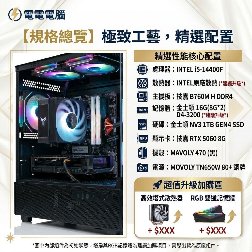 👉 雖然初始配置已足夠流暢運行,但為了讓您的性能怪獸發揮更極致的效能並展現您的電競信仰,我們強烈建議同步加購『高效塔式散熱器』和『RGB 記憶體』!大幅降低 CPU 溫度,效能顏值雙提升!立即點擊圖片 2 查看更多升級項目!