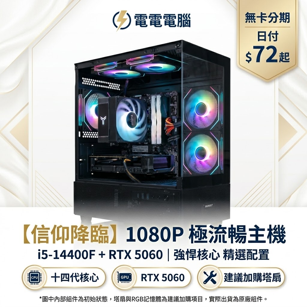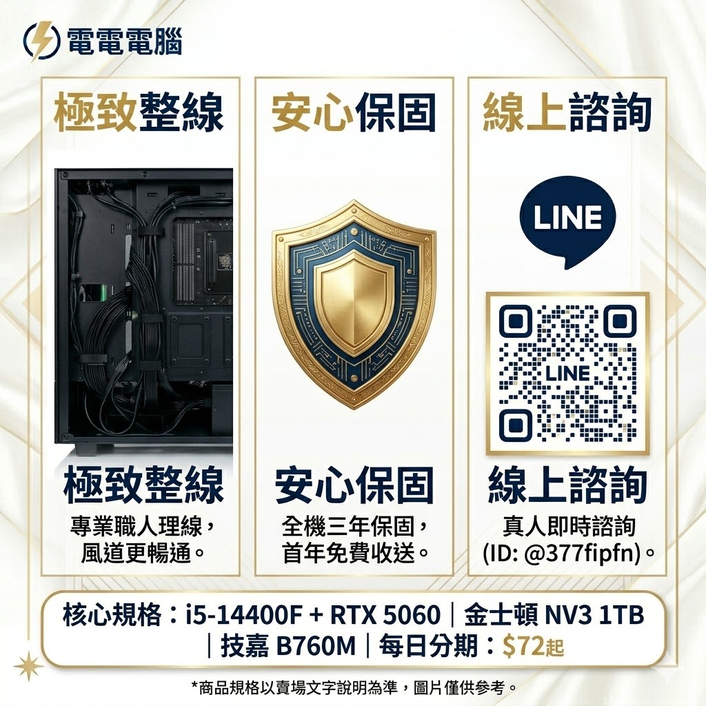 暗黑機殼,白金奢華!這台配置超Cap(十四代 + RTX 5060)的清透電競主機,日付僅 $72 起,每天一杯咖啡的錢就能入手!還在猶豫什麼?立即擁抱你的電競信仰!