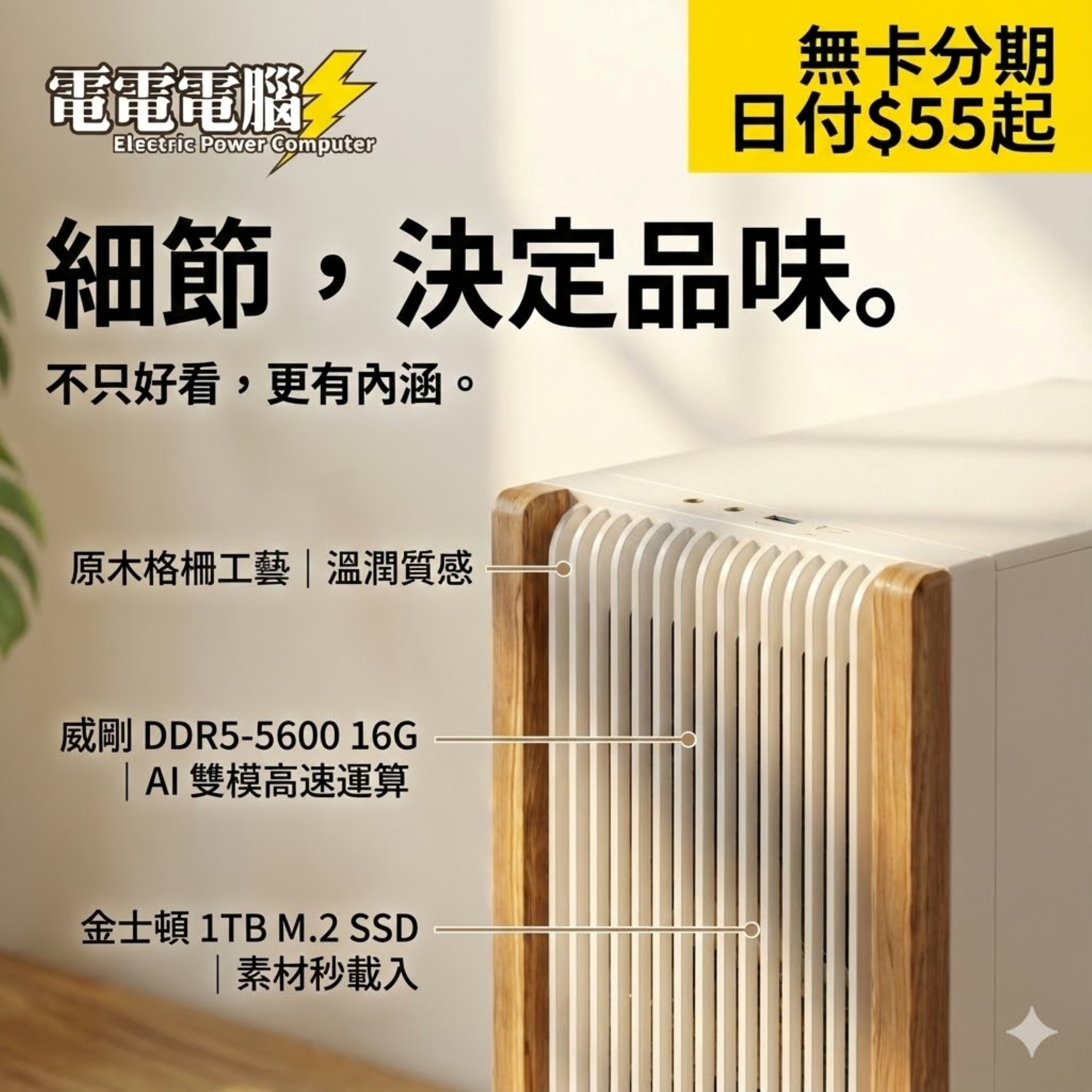 這台專為設計師、創作者、以及懂生活的你打造的「居家美學」主機,採用極簡的白色機身,搭配溫潤的木紋格柵設計。它不只是一台強大的生產力工具,更是你書桌上、客廳裡最優雅的藝術擺飾。無論是北歐風、無印風還是現代簡約風,它都能完美融入。