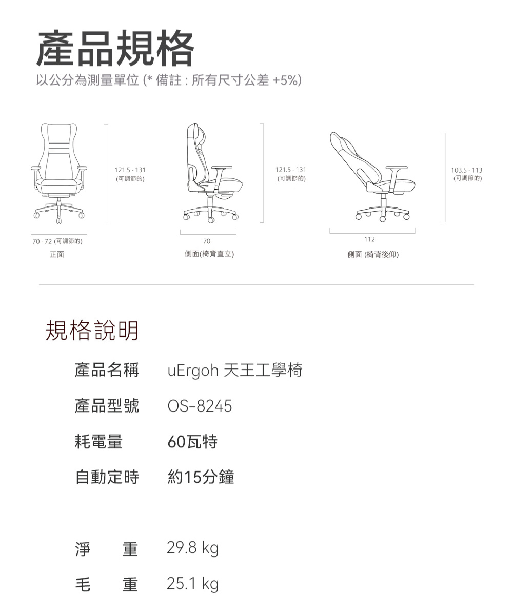 ◎椅背後仰尺寸:寬70-72cm x 長112cmx 高103.5-11