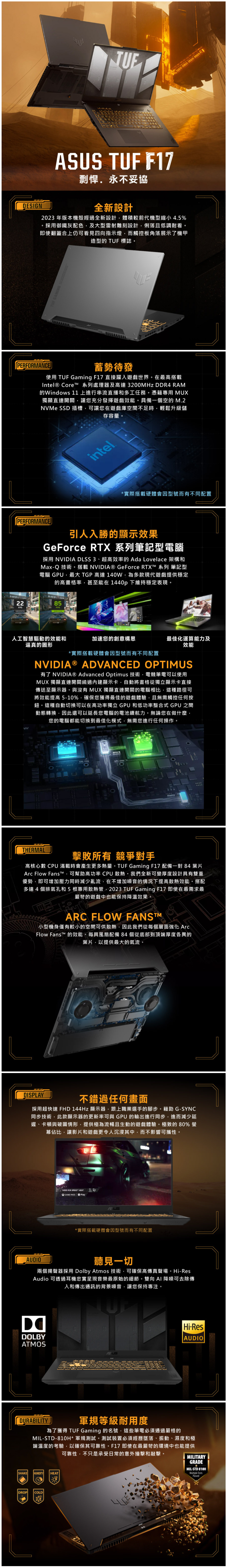 薄邊框 (軍規電競)intel Core 5 210H + 16GB RTX 3050 6GB GDDR6 支援Type-C PD 充電 MIL-STD-810H 軍規測試 支援G-SyncN防撕裂技術 單區RGB多彩鍵盤 實體數字鍵 / 單區RGB多彩鍵盤 HDMI & Thunderbolt 4 with Display Port 支援雙螢幕輸出 84 葉片 Arc Flow Fans™ / 5 組散熱管+4 個排氣口 Dolby Atmos & 雙向 AI 降噪技術 支援2個M.2 Pcie SSD 擴充Slot 支援WIFI 6 / 支援AI 降噪技術 / 支援TYPE-C PD 充電 30分鐘充電50%快充技術
