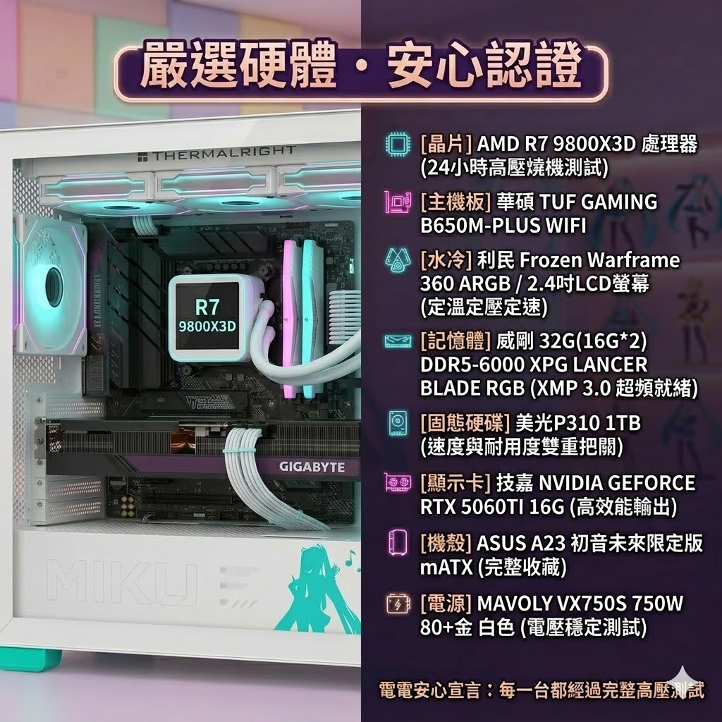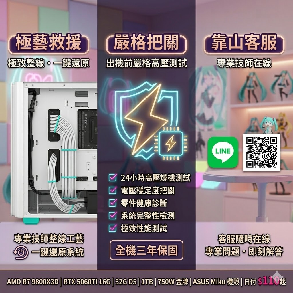 每一台都經高壓測試把關 💻:在出機前,這台初音未來聯名機皆經過 24小時嚴格燒機與高壓電壓測試 ⏳。我們針對處理器(R7 9800X3D)、顯示卡(黑色 RTX 5060TI)以及記憶體進行極限健康診斷,確保在最長直播時效下依舊穩定如山 🏔️。