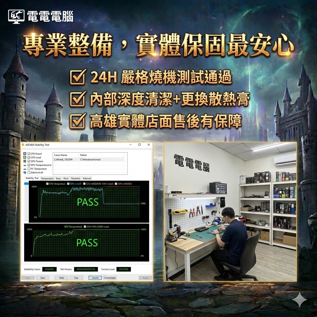 ✅ 電電電腦嚴選:身為高雄實體店家,我們比你更怕出問題。整機已完成深度清潔、更換散熱膏,並通過 24H 嚴格燒機測試,電源更選用大廠 Antec 650W,穩定耐操供電足。