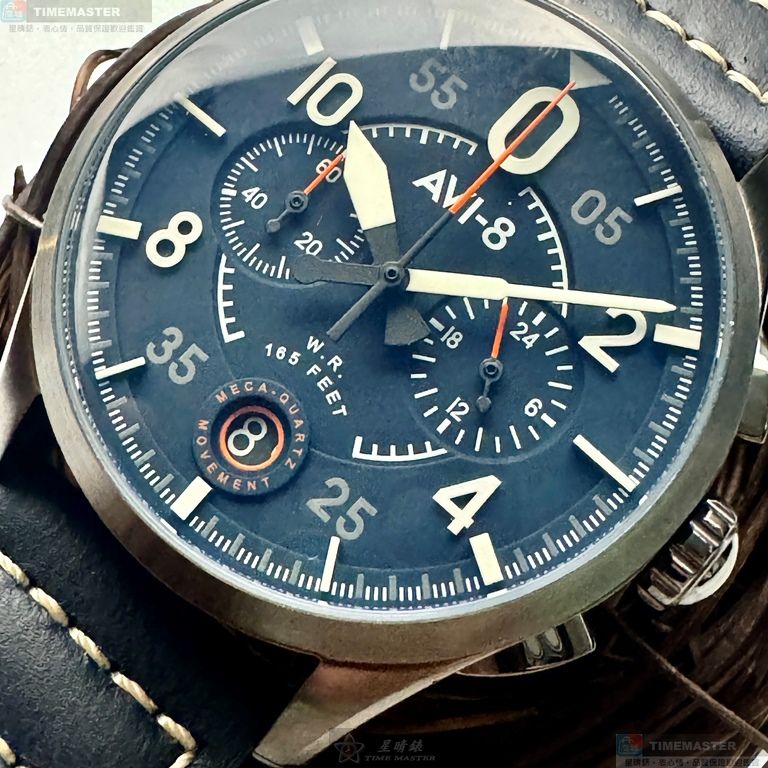 AVI-8 AV52668 男錶以42mm黑色精鋼圓形錶殼搭配寶藍色飛行面盤,呈現清晰中三針與二眼計時配置,是一款務實耐看的男士石英機芯手錶。