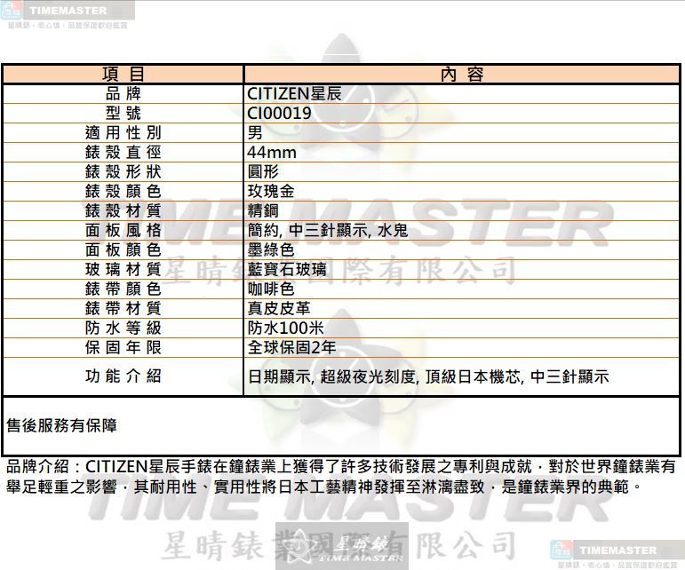 CITIZEN星辰CI00019提供全球保固2年保障,或許不是完美無缺,但星晴錶業希望每位配戴者都能感受到穩定與踏實的價值選擇。