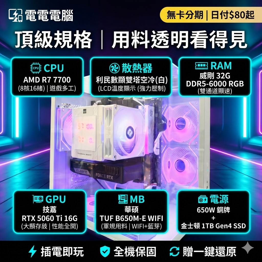 #電電電腦 #白色主機 #SIGHTS3 #數顯塔散 #利民 #R77700 #RTX5060Ti16G #高雄組電腦 #無卡分期