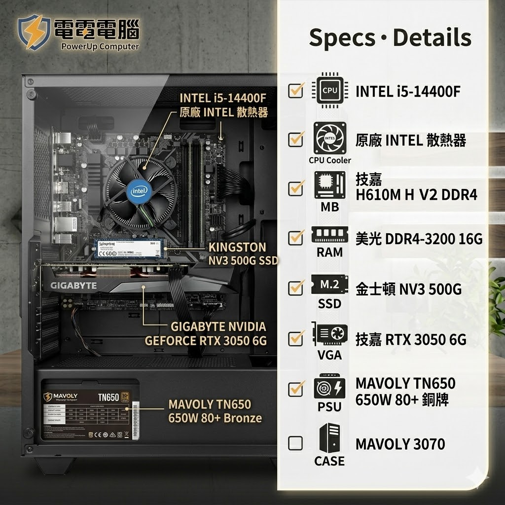 電源 (PSU):MAVOLY TN650 650W 80+銅牌 (認證穩定足瓦,保護全機零件)