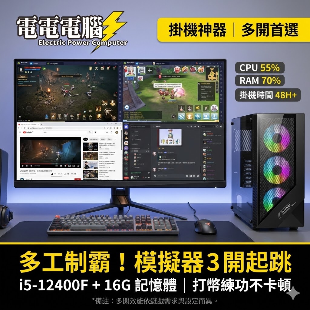 🎮 【專為「練功狂人」打造的穩定後盾】 還在用你的主力機掛網嗎?太傷了! 這台專為長時間運行打造的「掛機神器」,採用 Intel i5-12400F 搭配 RTX 3050 獨立顯卡,效能剛剛好,穩定又省電。 不管是《天堂》、《RO》掛網打寶,還是手遊模擬器多開練小號,交給它就對了!