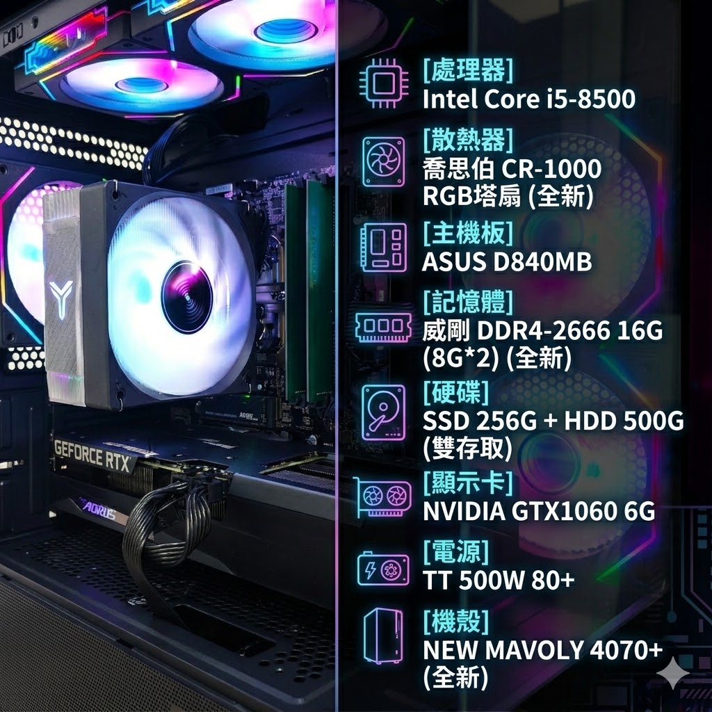 這不是一台普通的二手機,它是經過「電電電腦」首席總監親自調教、重獲新生的電競野獸!採用 全新 JONSBO喬思伯 CR-1000 RGB 塔扇 與 全新 NEW MAVOLY 4070+ 海景房機殼,搭配嚴選強力硬體,打造極致的「暗黑賽博龐克」光影饗宴。