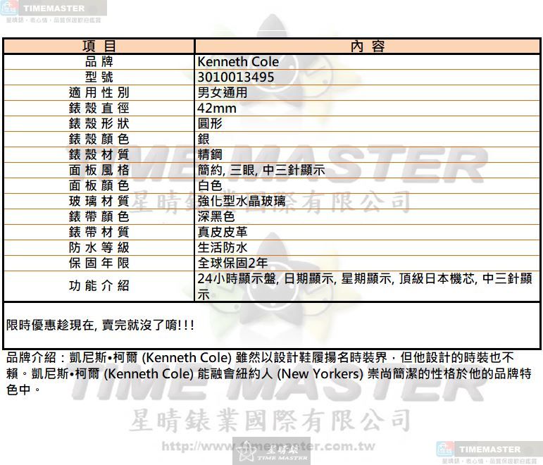 限時優惠趁現在, 賣完就沒了唷!!!,星晴錶業代理的Kenneth Cole 3010013495.0男女通用手錶,以42mm銀色精鋼圓形錶殼搭配白色簡約三眼面盤,呈現俐落耐看的日常質感。