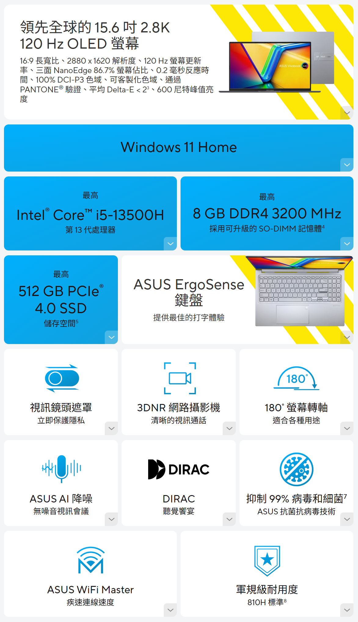 FHD OLED 影像真實呈現 86% 屏佔比 / 可180度開合/支援PD充電 軍規認證/抗菌處理技術 / 可升級記憶體 100% DCI-P3 / PANTONE® 驗證 平均 Delta-E < 2/ 600 尼特峰值亮度 TÜV 低藍光護眼認證/SGS護眼認證
