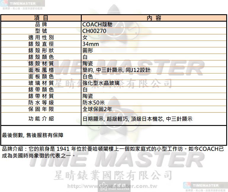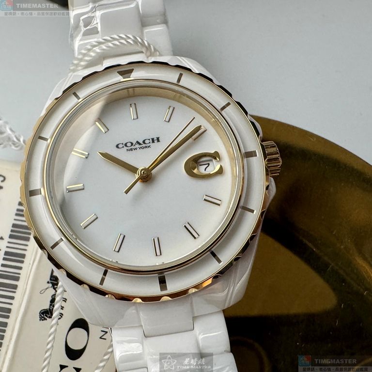 最後倒數, 售後服務有保障,COACH蔻馳女錶推薦CH00270,以34mm圓形白色陶瓷錶殼搭配簡約白面盤設計,為日常穿搭提供乾淨俐落的質感選擇。