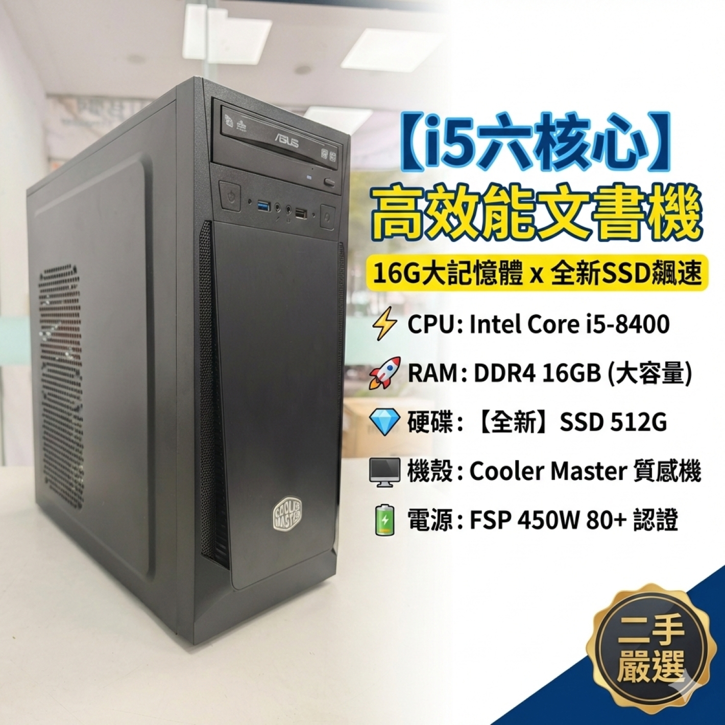 別再買來源不明的拼裝機了!這台採用 Intel 正式版 i5-8400 六核心處理器,搭配 Cooler Master 原廠機殼 與 全漢 (FSP) 80+ 認證電源,用料扎實,散熱好、穩定性高,是辦公室、居家使用的長壽機種!