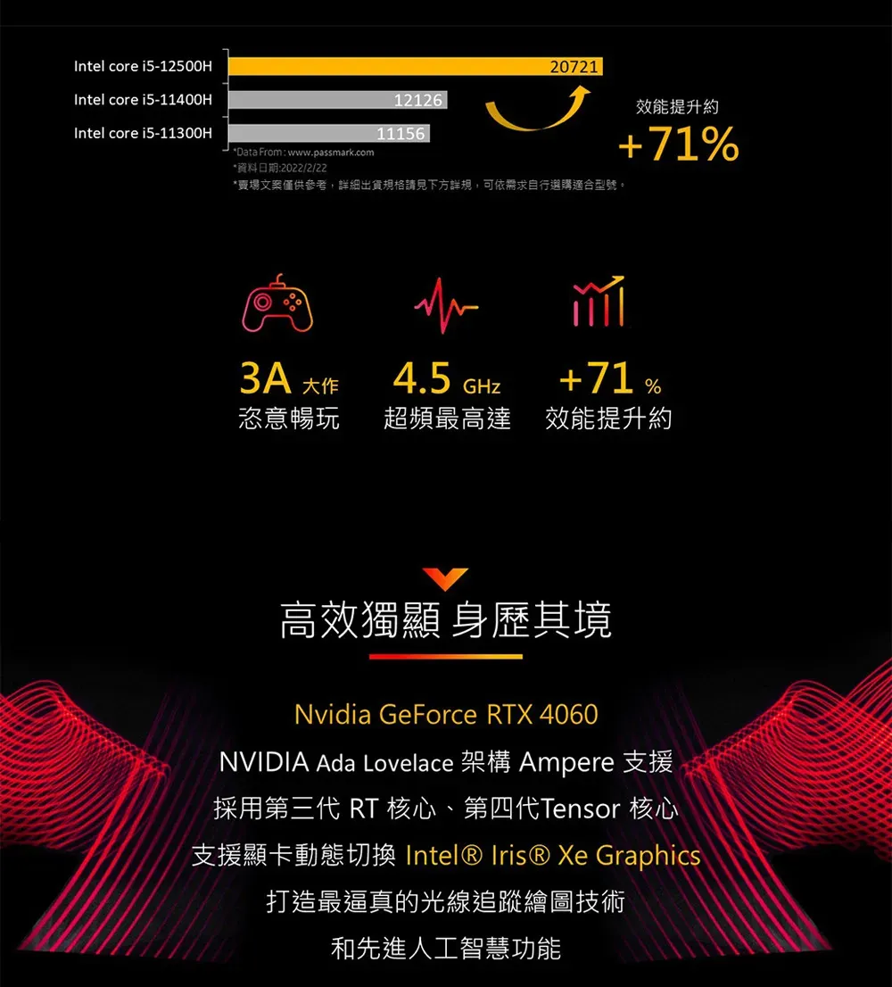 中央處理器型號: 12th Gen Intel Core i5-12500H Intel 7/ 12核心(4P+8E), 16執行緒 / TDP 45W (2.5GHz, turbo up to 4.5GHz, L3 cache 18MB)