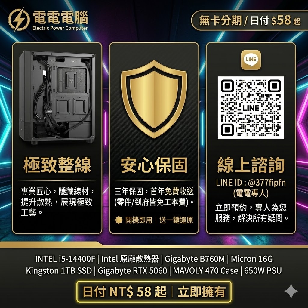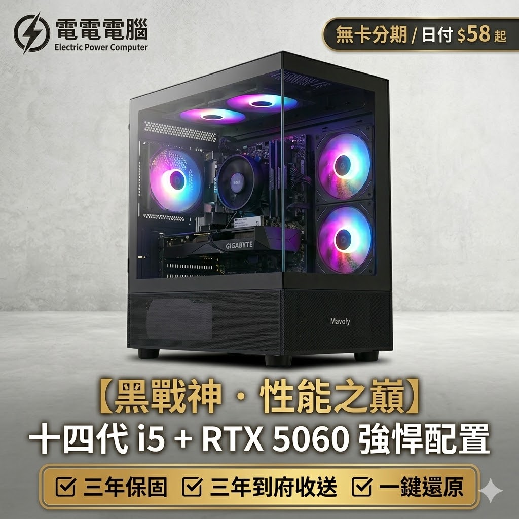 我們將最新的 Intel 第 14 代 i5-14400F (十四代核心) 處理器與萬眾矚目的 Gigabyte RTX 5060 8G 雙風扇版顯示卡完美結合,安裝在 MAVOLY 470 極致清透黑機殼中。