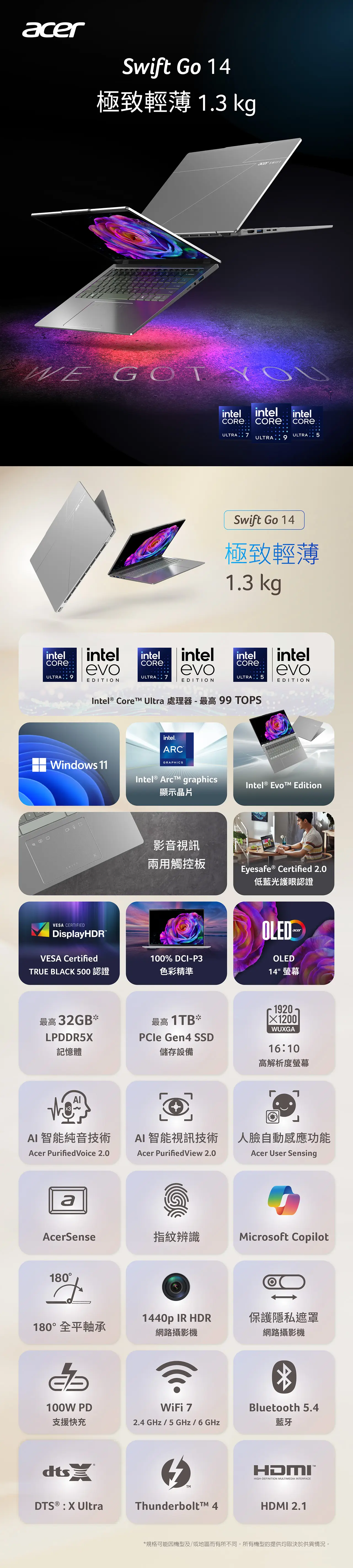 全新外觀設計,漸層色鍵盤 纖薄美型,鋁合金機身,厚度最薄僅9.6mm 可180度攤平 影音視訊兩用觸控板,使用更方便 Intel Core Ultra(Series 2)處理器 99 Total TOPs 內建AcerSense智能應用工具,一鍵掌控筆電狀況