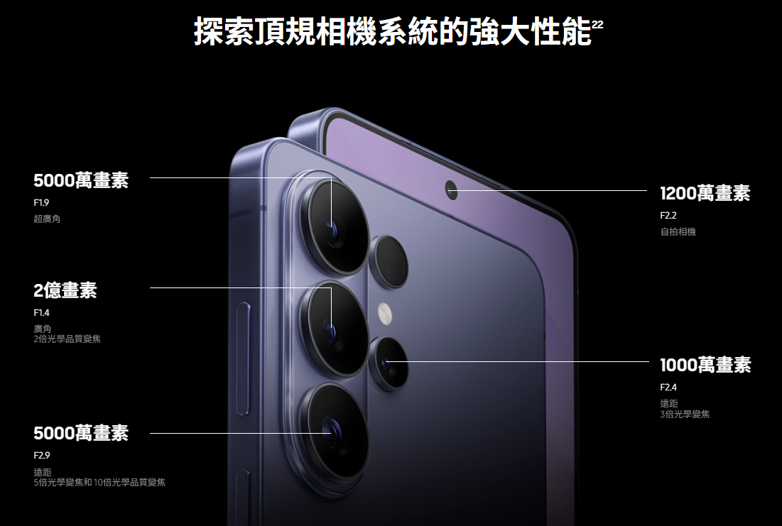 ◎ 後置 2 億畫素主鏡頭 + 5,000 萬畫素超廣角鏡頭 + 1,000 萬畫素 3x 長焦鏡頭 + 5,000 萬畫素 5x 長焦鏡頭