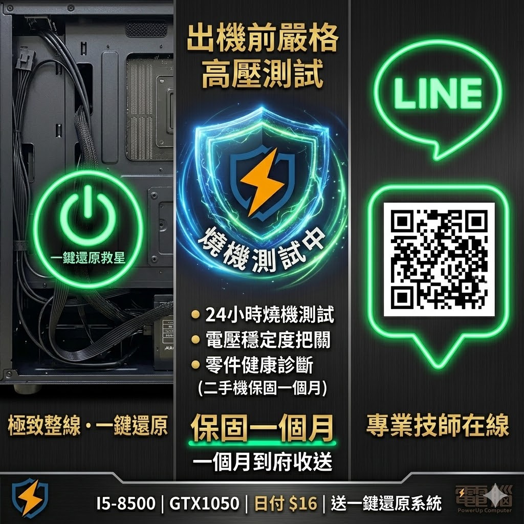 親愛的消費者,我們知道您對二手機有疑慮。請放心,每一台「電電電腦」出機前皆經過我們專業技師的「24小時高壓燒機測試」,從 CPU 電壓到記憶體穩定度,我們無一不把關。我們的二手機也配備了全台首創的「一鍵還原系統」,電腦壞了不求人,只需輕輕一按,立即恢復最佳狀態,免除重灌的煩惱與費用。買電腦,找電電,讓您享受划算與安心!