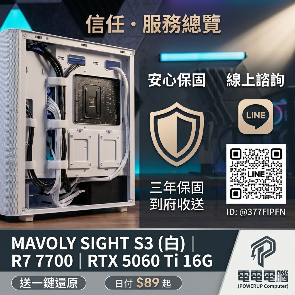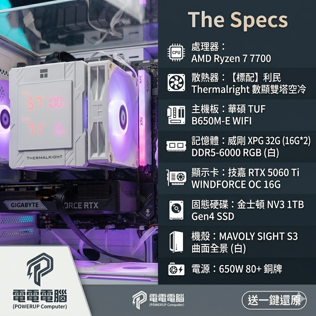 #電電電腦 #白色主機 #SIGHTS3 #數顯塔散 #利民 #R77700 #RTX5060Ti16G #高雄組電腦 #無卡分期