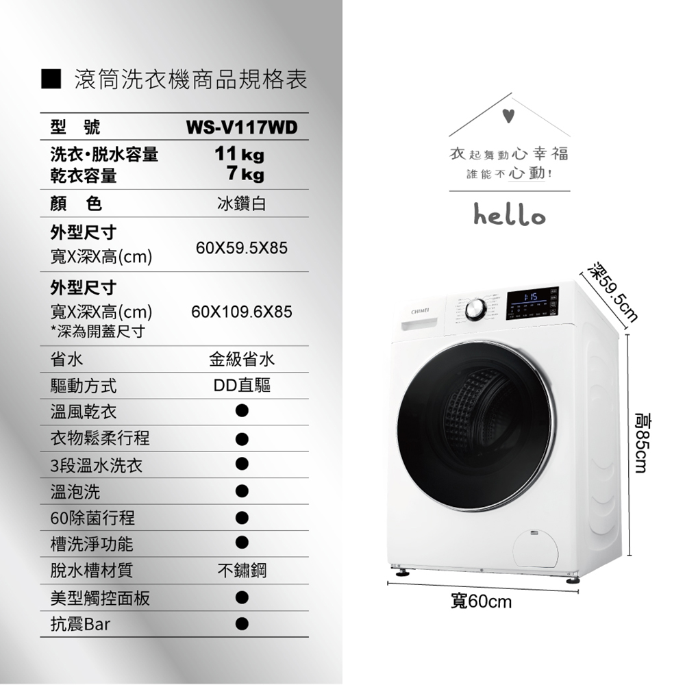 最大洗衣量(乾燥衣物):11kg(洗脫)/7kg(乾衣)