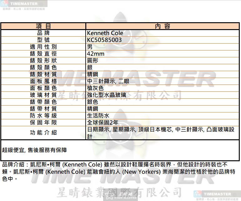 星晴錶業肩負將每一只 KC50585003 男錶妥善交到顧客手中的責任,讓品質與服務成為我們長久經營的使命。
