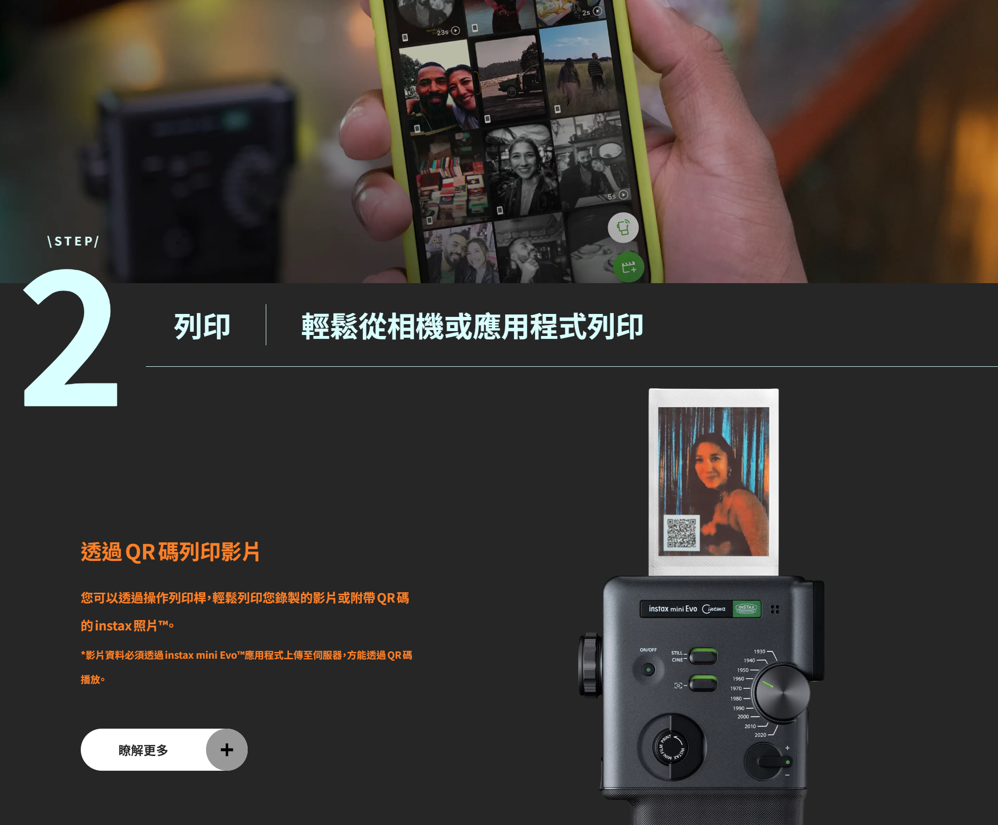透過與專用 App 的整合,mini Evo Cinema 成為一款兼具影片拍攝、靜態攝影與手機列印功能的 3 合 1 裝置。