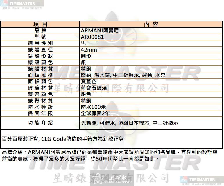 百分百原裝正貨, CLG Code防偽的手錶方為新款正貨,ARMANI阿曼尼AR00081以務實的光動能機芯運作,雖非旗艦定位,但能在日常使用中保持穩定可靠的性能。