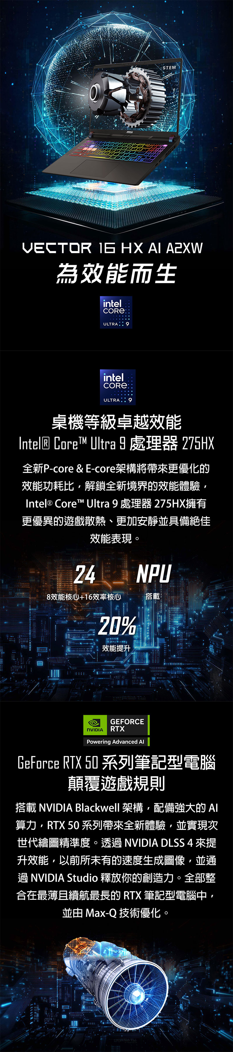 搭載 Intel® Core™ Ultra 9 處理器 275HX 搭載 NVIDIA® GeForce RTX™ 5070Ti 筆記型電腦 NVIDIA® GPU 12GB GDDR7 24區RGB全彩背光電競鍵盤