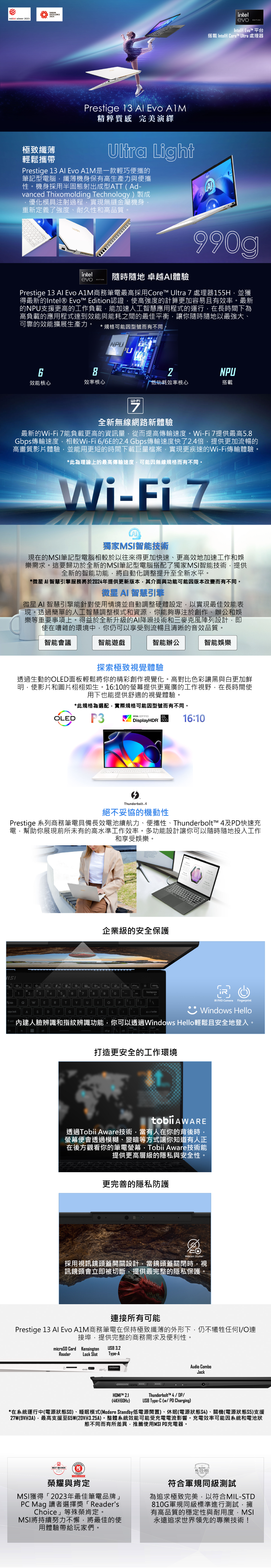 Intel® Evo™ 搭載Intel® Core™ Ultra 7 處理器155H 搭載Intel® Arc™ 顯示卡 13.3吋 2.8K (2880 x 1800), 16:10黃金比例, 100% DCI-P3色域範圍, OLED面板 支援Wi-Fi 7 Thunderbolt™ 4多工連接性能 獨家微星AI智慧引擎針對使用情境自動切換最佳效能模式 搭載DTS Audio 音效技術 Windows 11 Pro