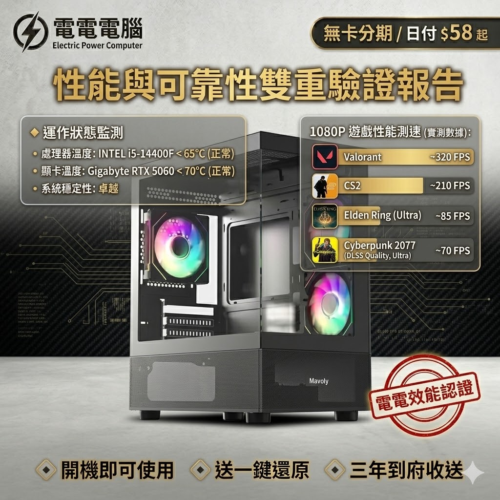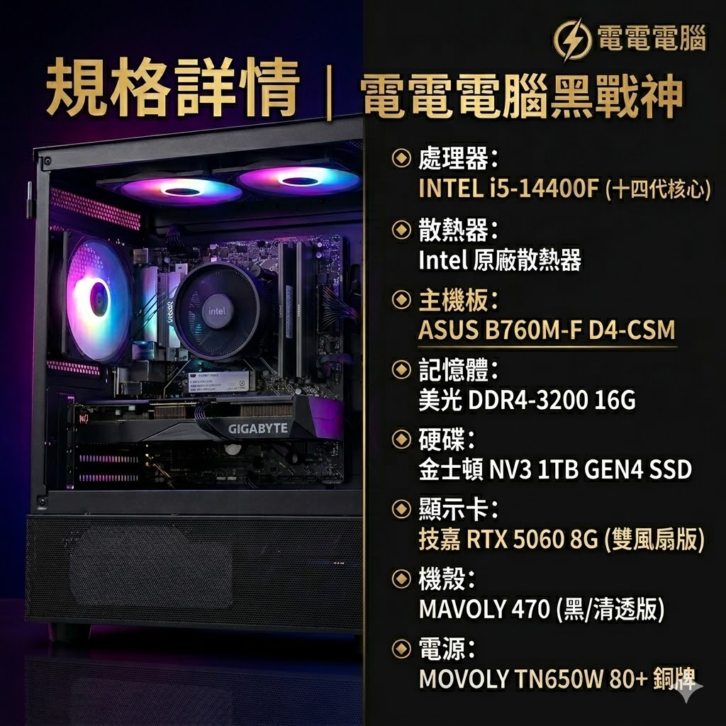 我們將最新的 Intel 第 14 代 i5-14400F (十四代核心) 處理器與萬眾矚目的 Gigabyte RTX 5060 8G 雙風扇版顯示卡完美結合,安裝在 MAVOLY 470 極致清透黑機殼中。